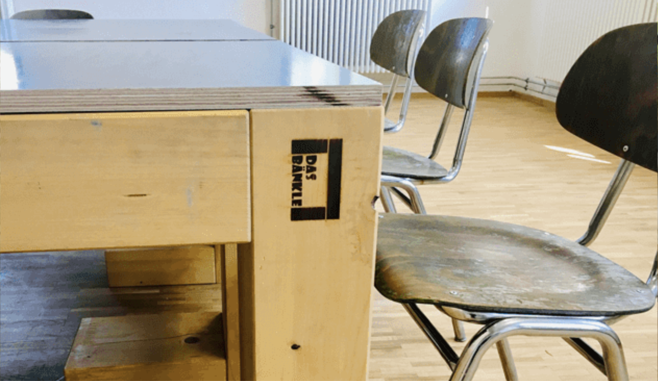 Innenaufnahme eines Raumes mit Holzstühlen, einem Holztisch und einem Lichtrohr.